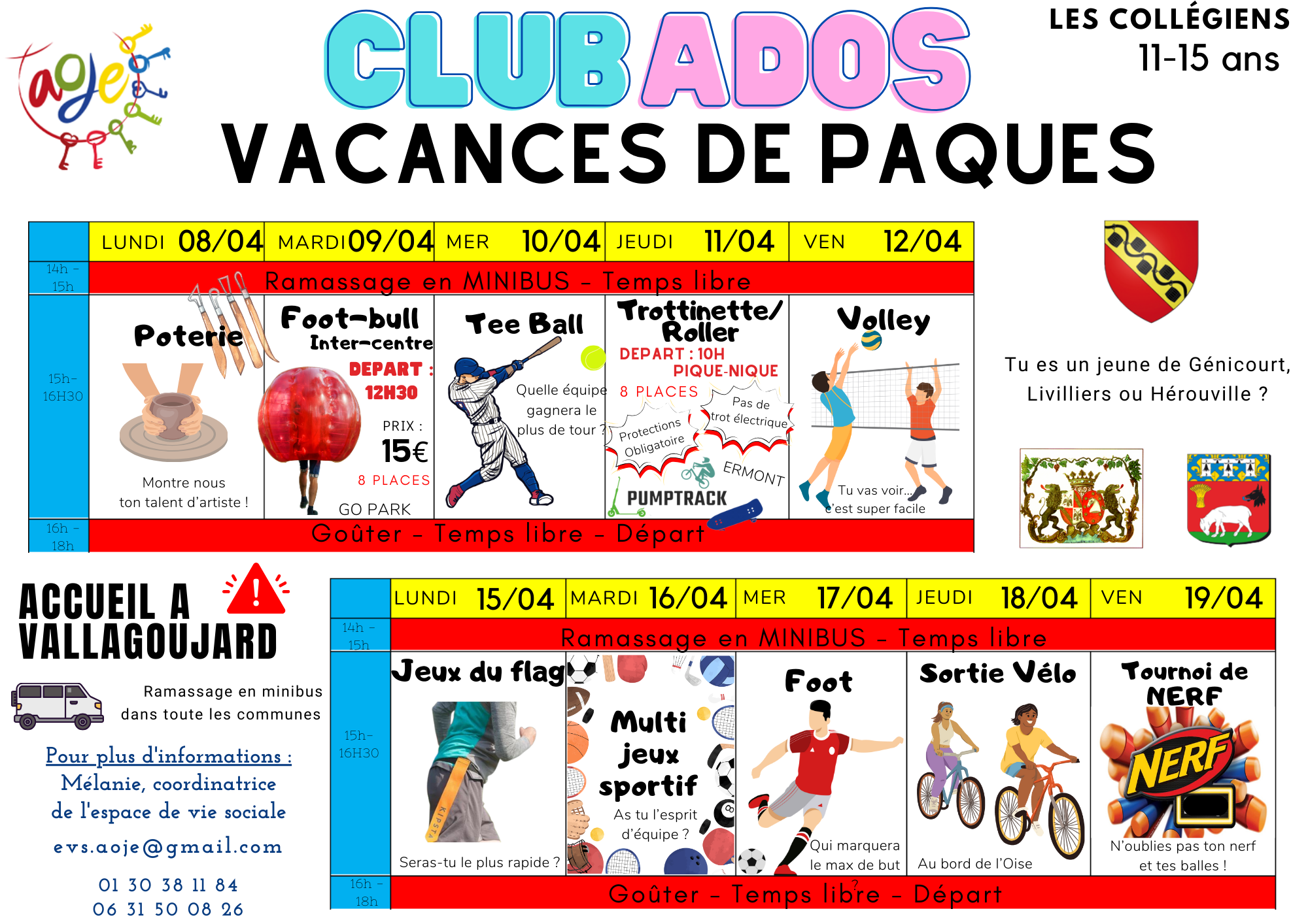 Il a été remarqué qu’il y avait moins d’inscriptions pendant les vacances par rapport aux mercredis. Par conséquent, il a été décidé de regrouper le club ados de Génicourt avec celui de Vallangoujard. Pour les familles intéressées, il est proposé d’accueillir les enfants le matin où Hugo les prendra en charge à 9h30.